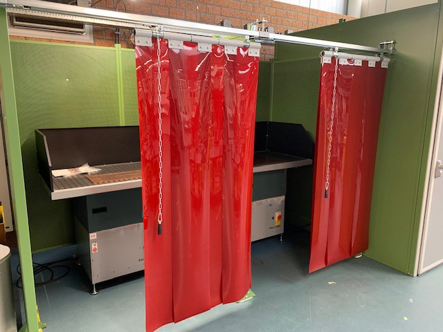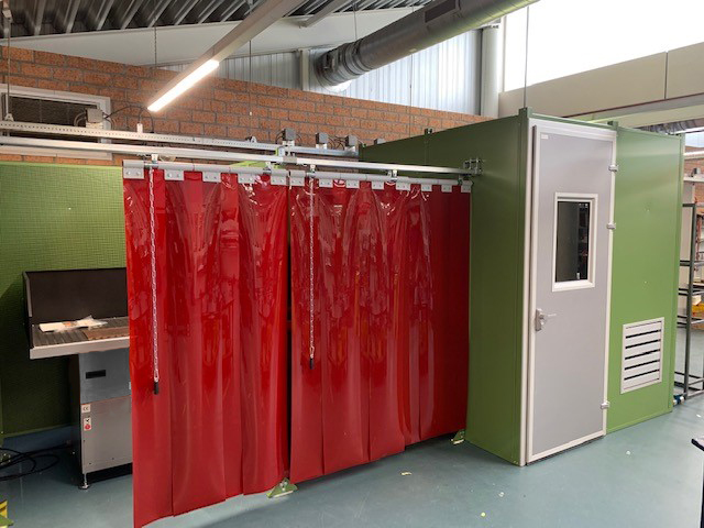 Twee flexibele lascabines met gecertificeerde laslamellen en een geïntegreerde, geluidsisolerende slijpcabine die als cabine losstaand of gekoppeld kan functioneren.