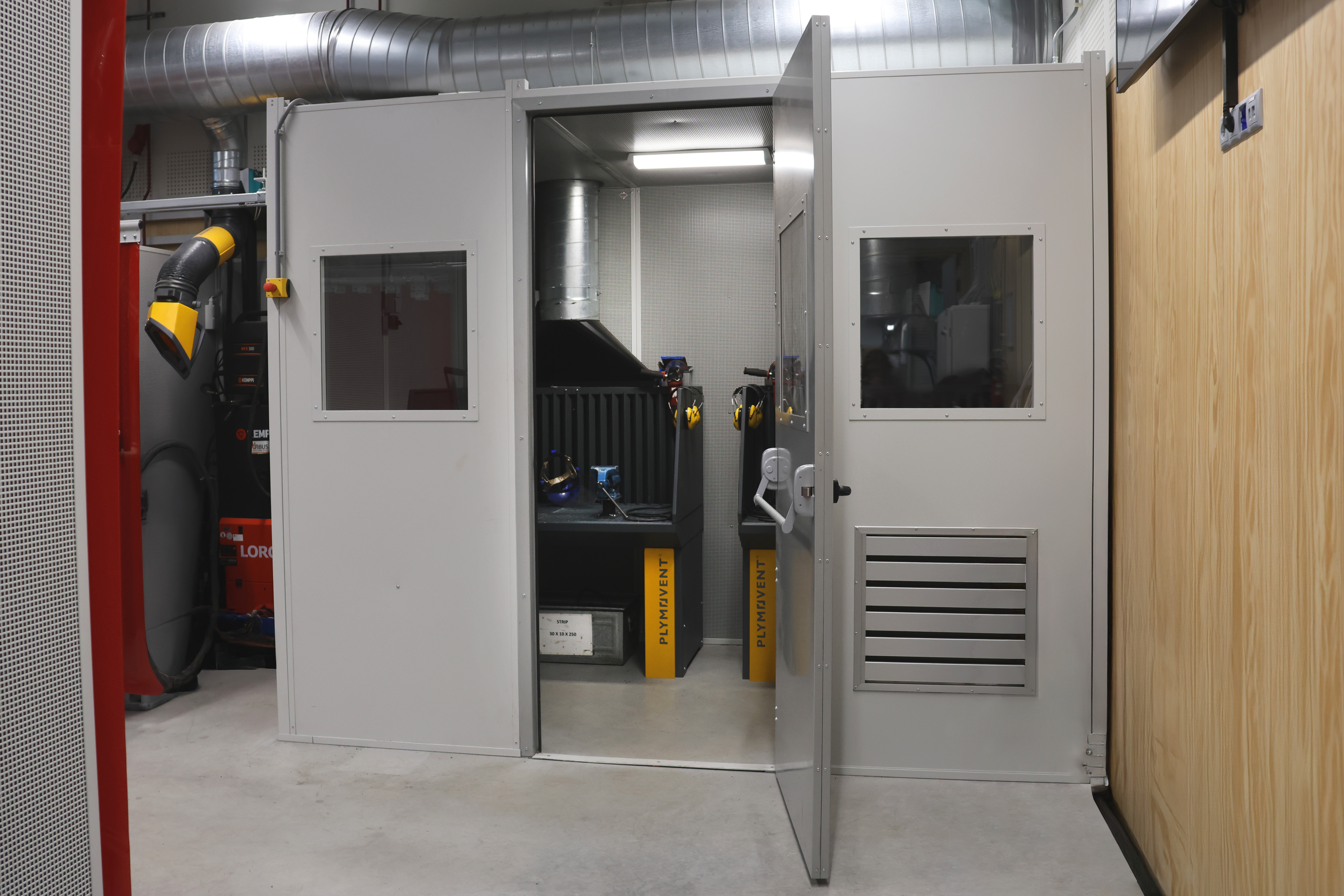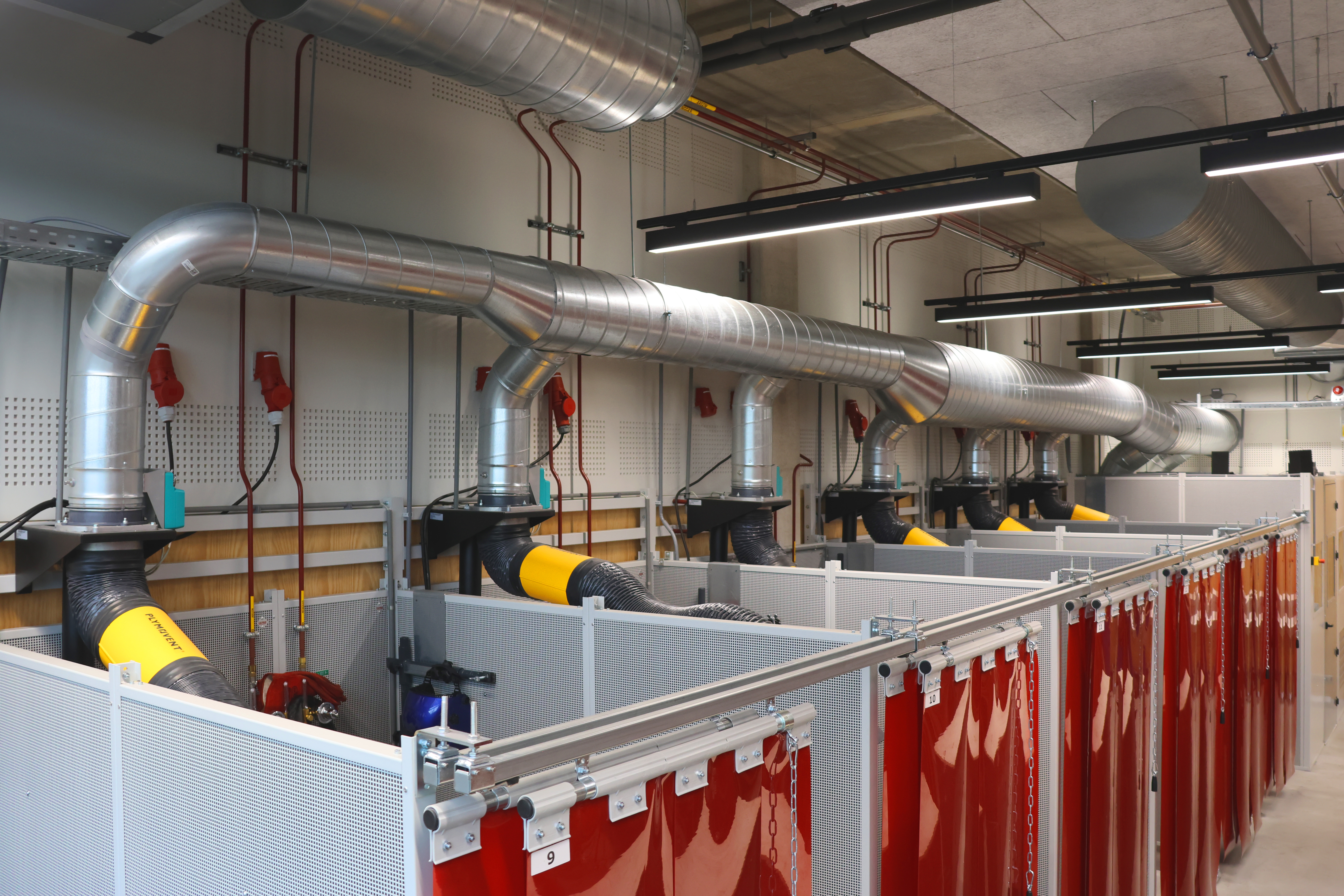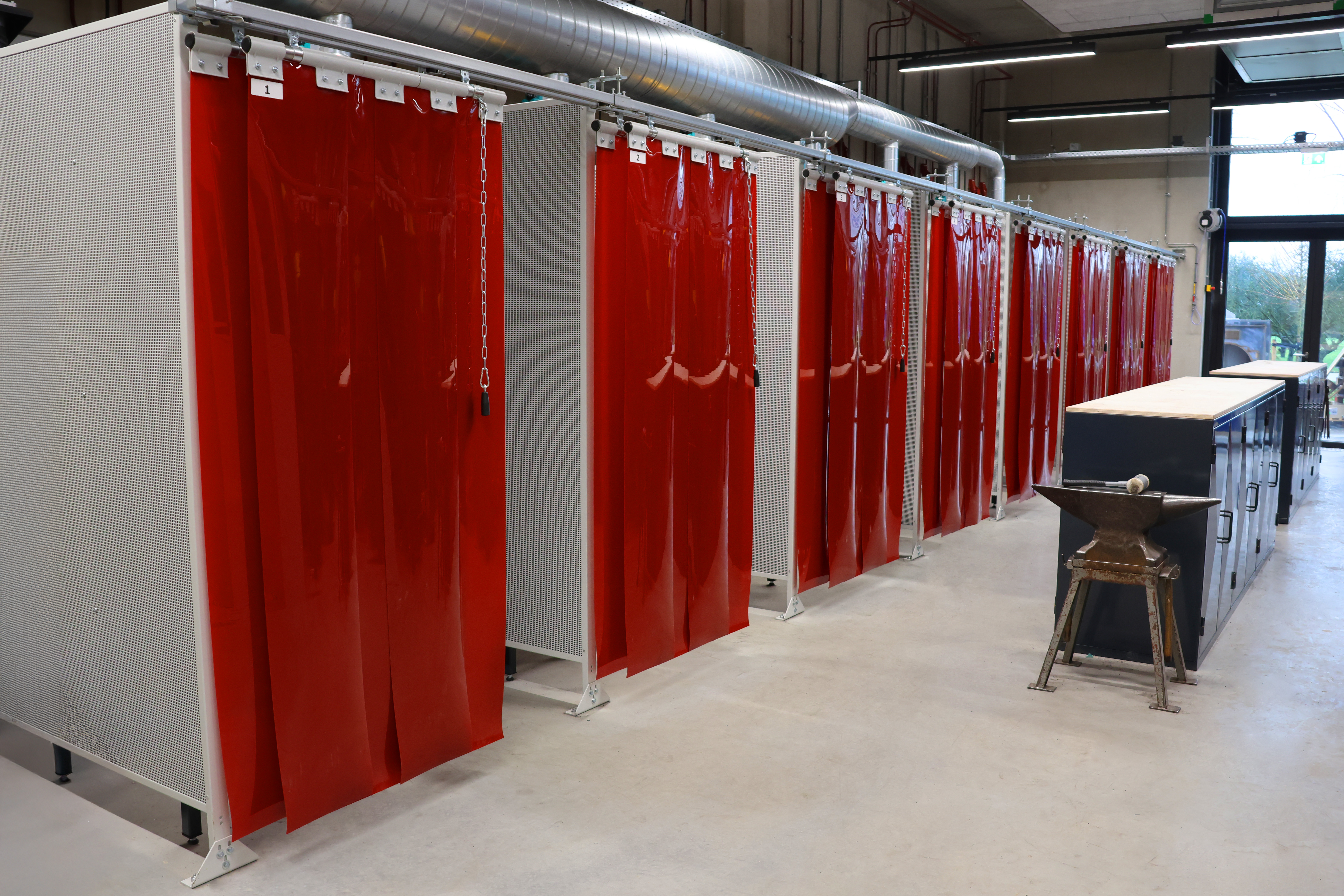 Voor de laszones werd gekozen voor Cepro-lascabines, die bekendstaan om hun geluidsabsorberende eigenschappen en modulaire flexibiliteit. Deze cabines maken het mogelijk om verschillende lasmethodes toe te passen, terwijl studenten en docenten beschermd blijven tegen geluid en straling. Ook qua uitstraling sluiten de cabines aan op de moderne inrichting van het gebouw.